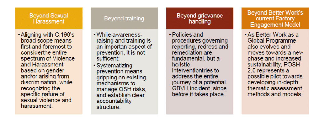 With ILO Convention No. 190 being adopted in 2019, the demand for BW’s services in this space has also increased and multiplied. At the same time, on the side of Better Work’s Global Secretariat, a need emerged to harmonize and converge again around an approach which is as much as possible harmonized across countries and also aligns with C.190’s principles and overall call for integrated and broad-scope approaches.